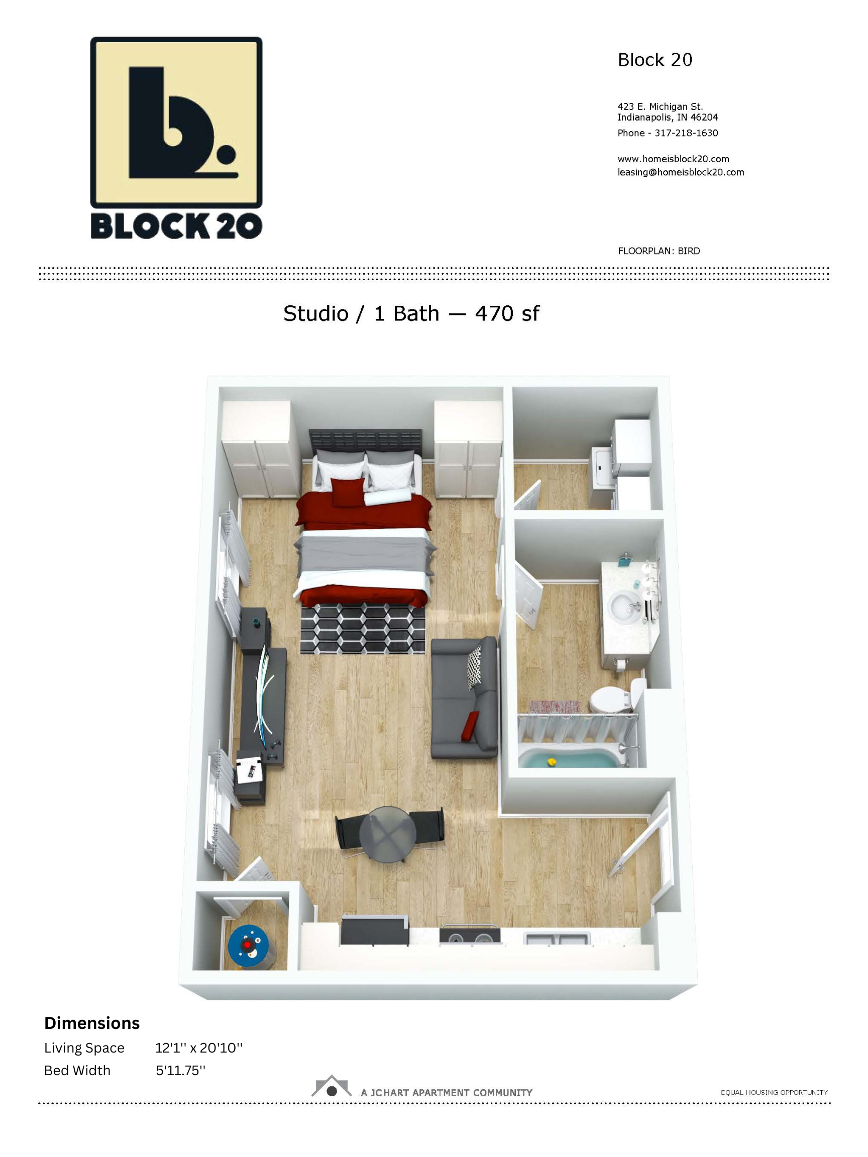 Bird Floor Plan470 Sq Ft 0 Bed / 1 BathCheck Pricing & AvailabilitySchedule TourView 3D TourApartment FeaturesBack