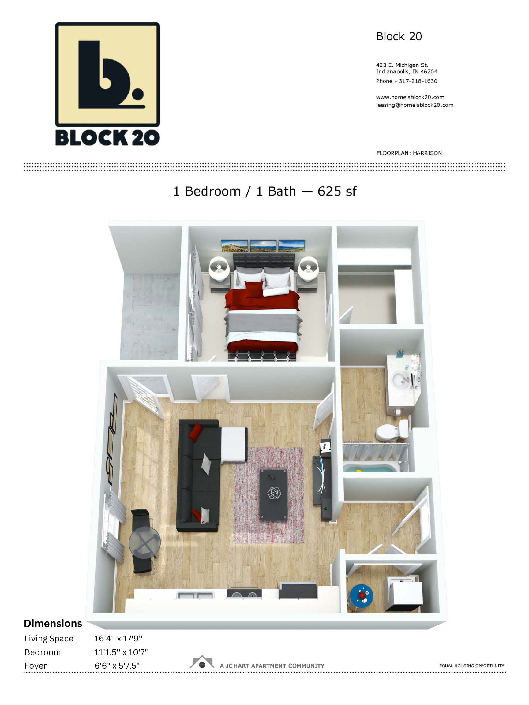 Harrison Floor Plan625 Sq Ft 1 Bed / 1 BathCheck Pricing & AvailabilitySchedule TourView 3D TourApartment FeaturesBack