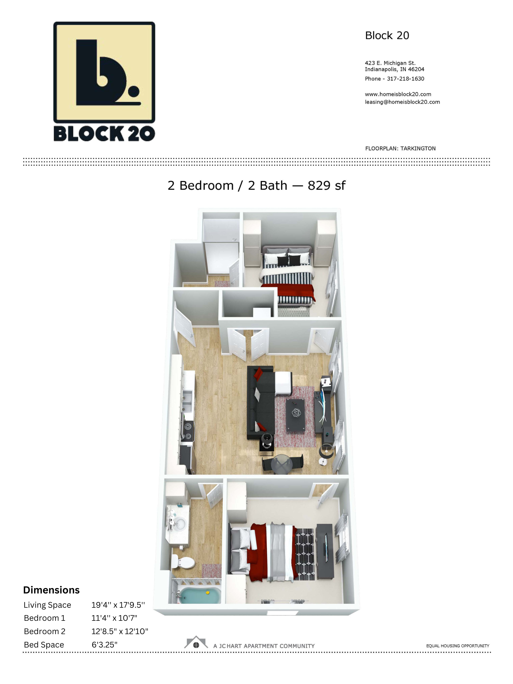 Tarkington Floor Plan 829 Sq Ft 2 Bed / 2 Bath(s) Check Pricing & AvailabilitySchedule Tour View 3D Tour Apartment Features Back