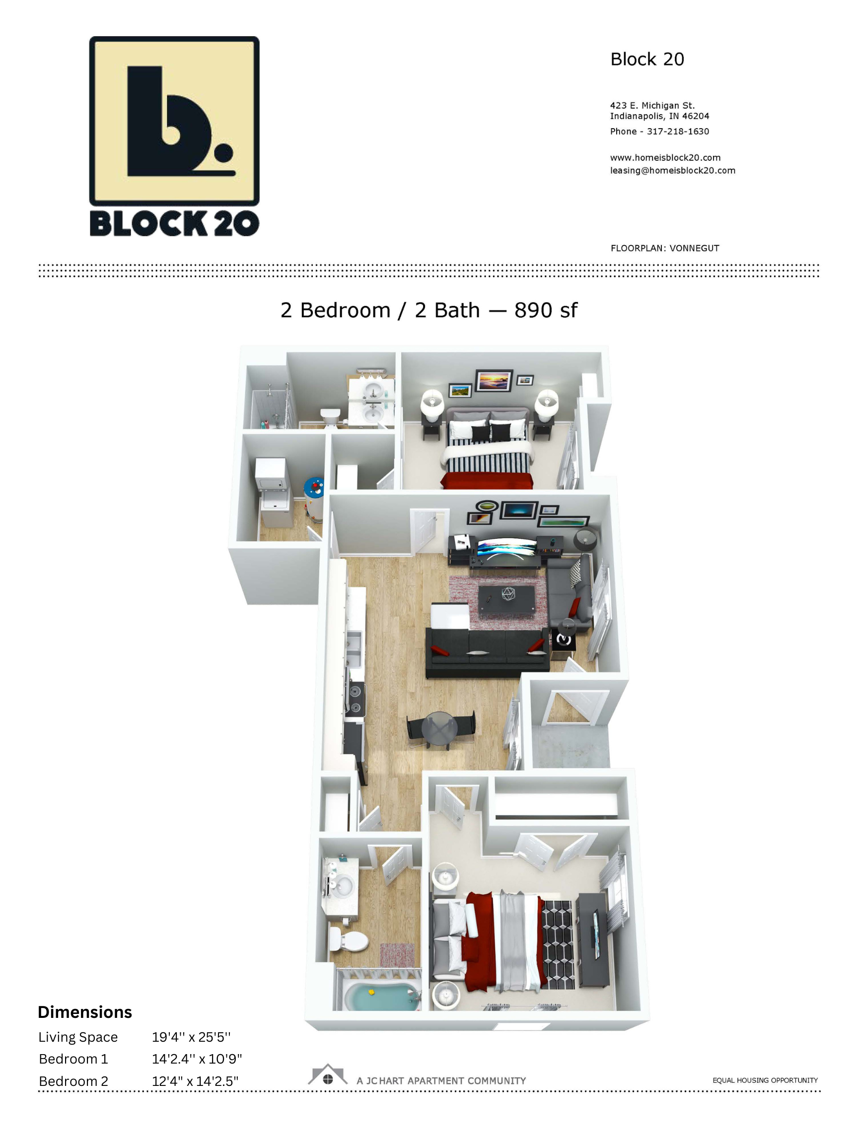 Vonnegut Floor Plan890 Sq Ft 2 Bed / 2 Bath(s)Check Pricing & AvailabilitySchedule TourApartment FeaturesBack